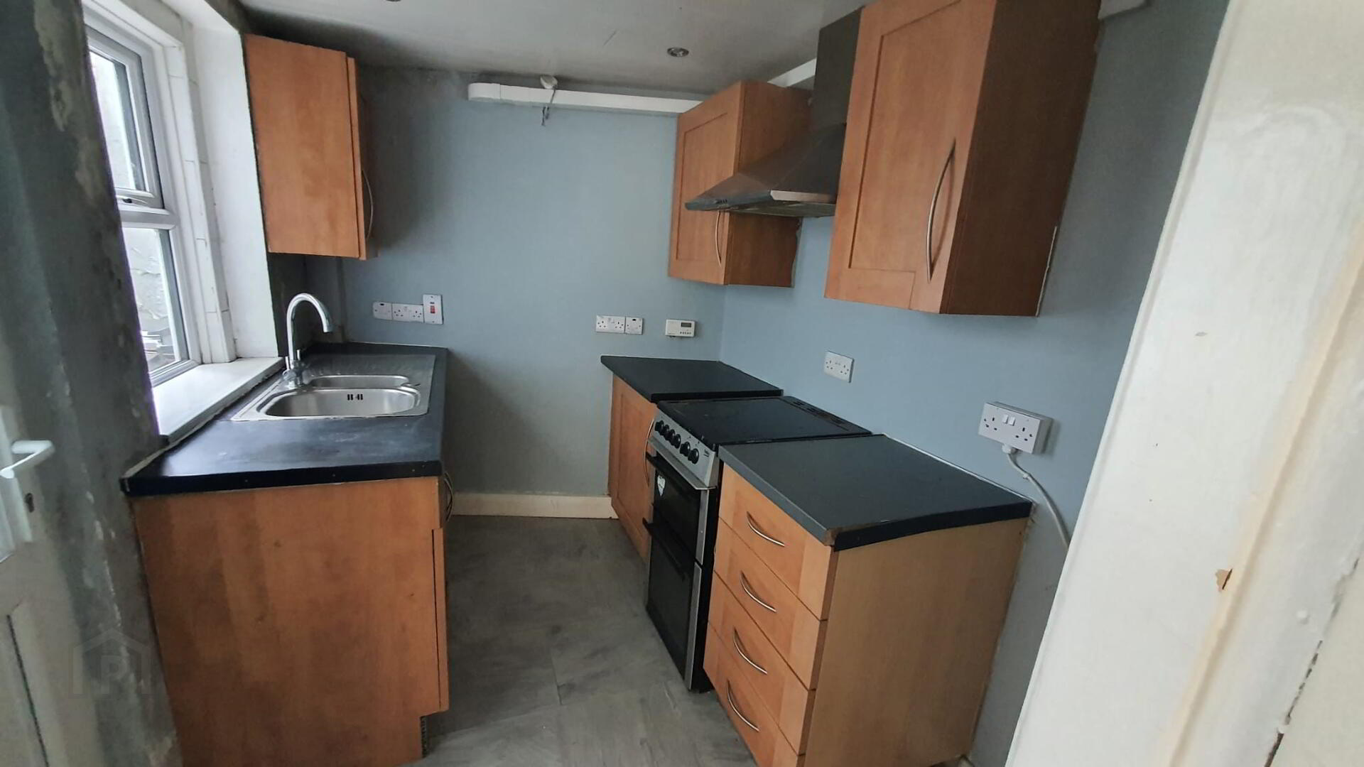 A galley style kitchen with high and low level units. 1 ½ stainless steel sink unit with mixer tap. Space for cooker with extractor fan fitted over.