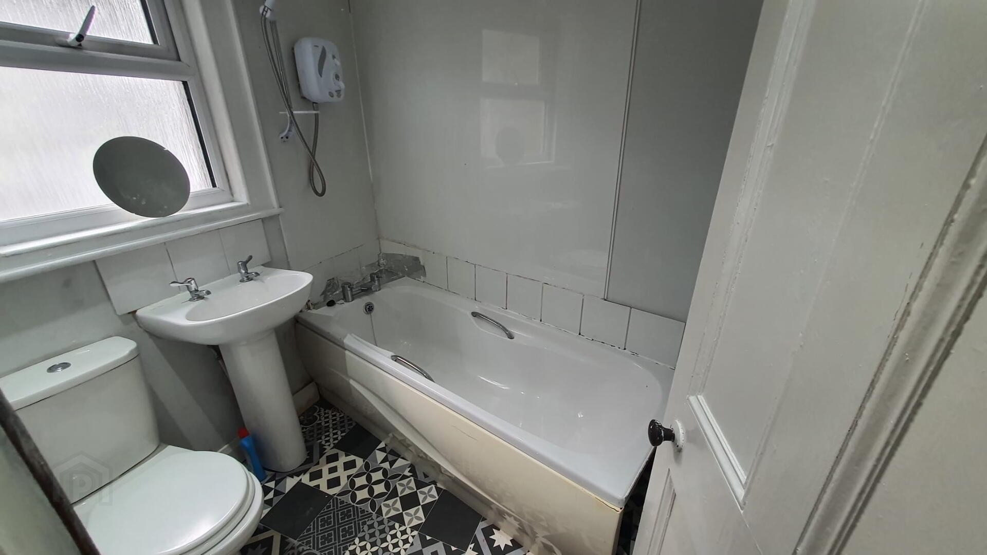 With bathtub and power shower fitted over, pedestal wash hand basin and low flush W.C. Radiator.