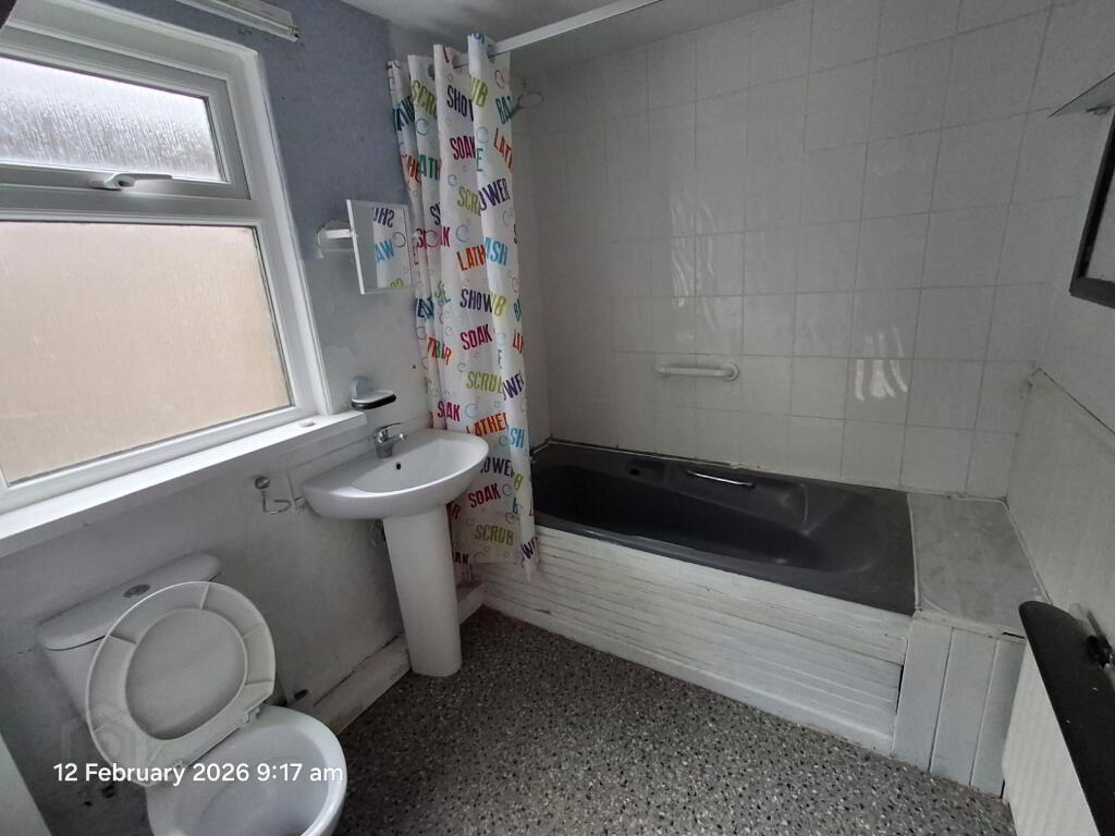 With bathtub and mixer tap and shower attachment. Low flush W.C., and pedestal wash hand basin.