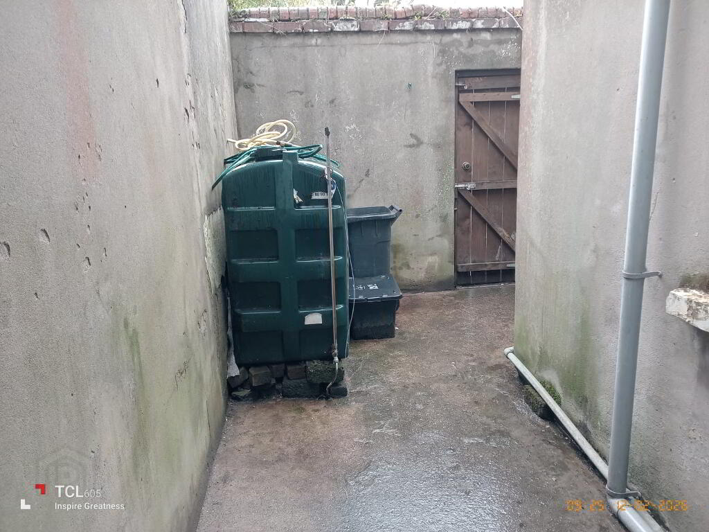 Concreted yard with oil tank and outside tap.